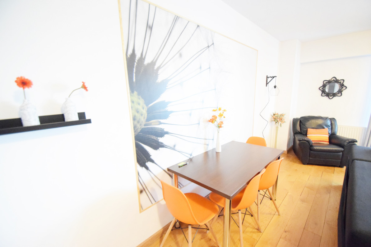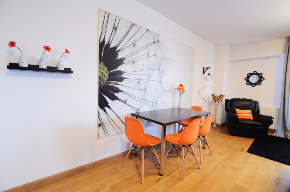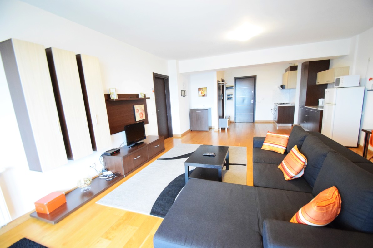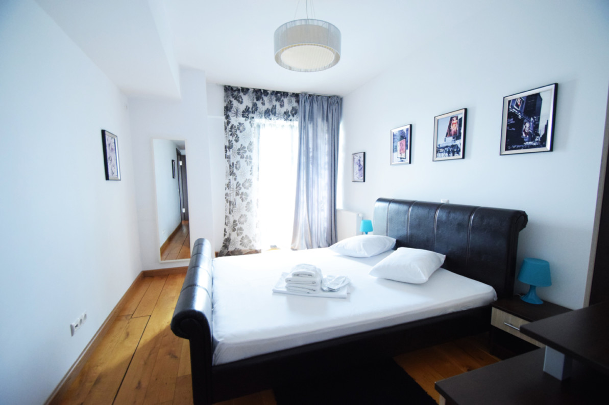 Apartamentul este spatios, mobilat modern si utilat complet. In living room se afla un coltar extensibil de dimensiuni generoase, in fata comodei TV. Tot in camera de zi este si o masa cu patru scaune. Bucataria deschisa asigura functionalitatea apartamentului. Deasemenea bucataria intr-un apartament in regim hotelier reprezinta un avantaj pentru cei care doresc sa gateasca.