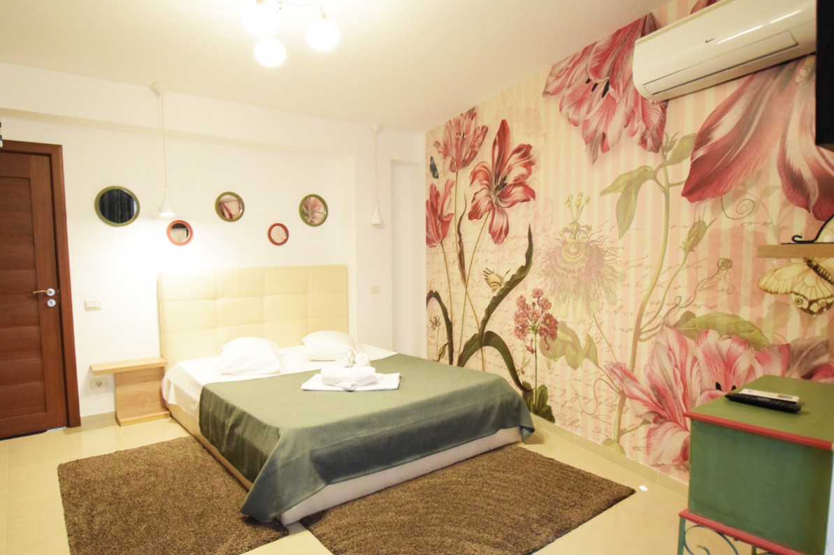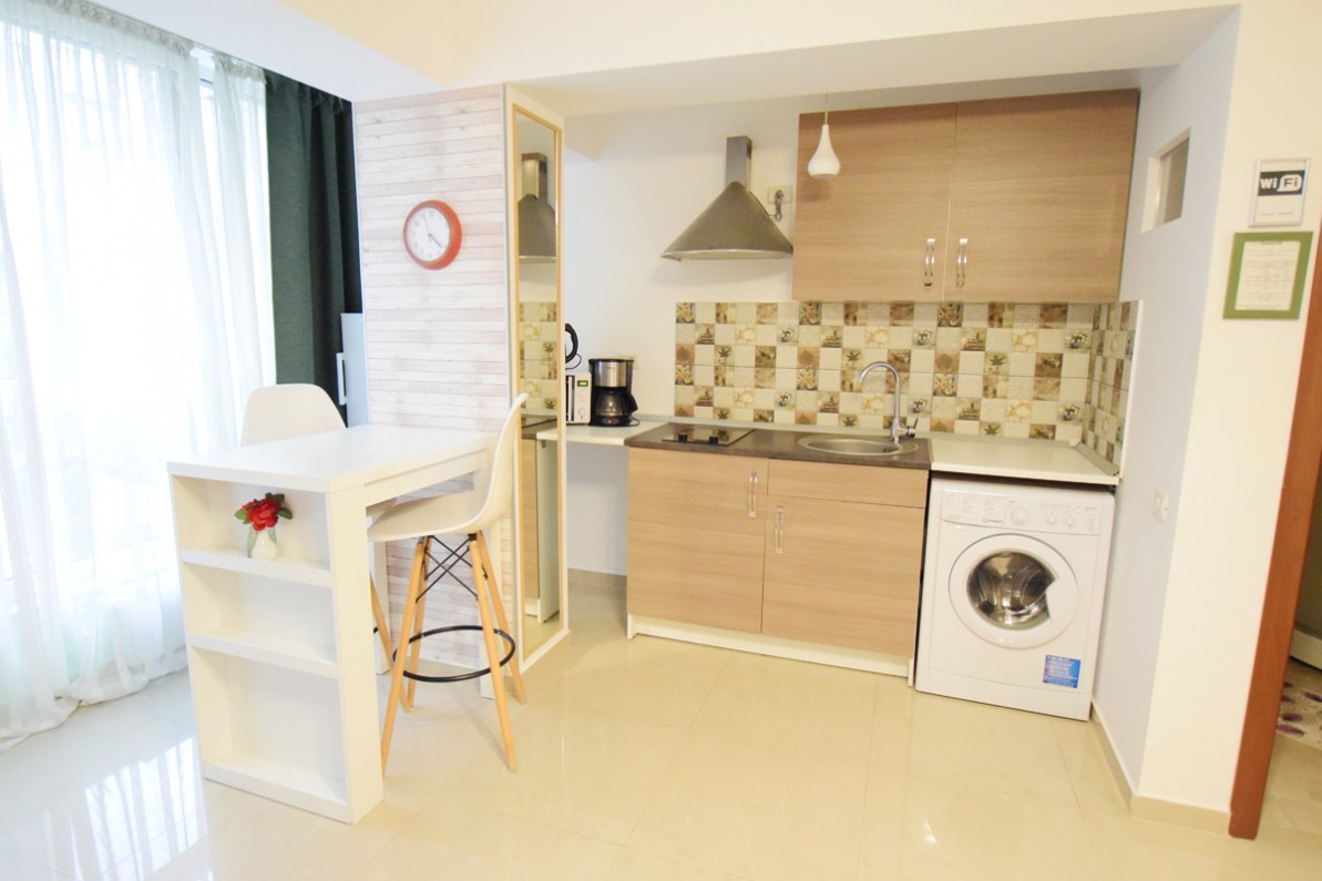 Garsoniera in regim hotelier, este mobilata cu dulap spatios pentru haine, pat dublu si o comoda cocheta. Deasemenea locatia are in dotare cablu TV si internet WI-FI dar si electrocasnice precum televizor LED, cuptor cu microunde, frigider, etc. Micile detalii decorative completeaza garsoniera creand spatiul ideal de relaxare.