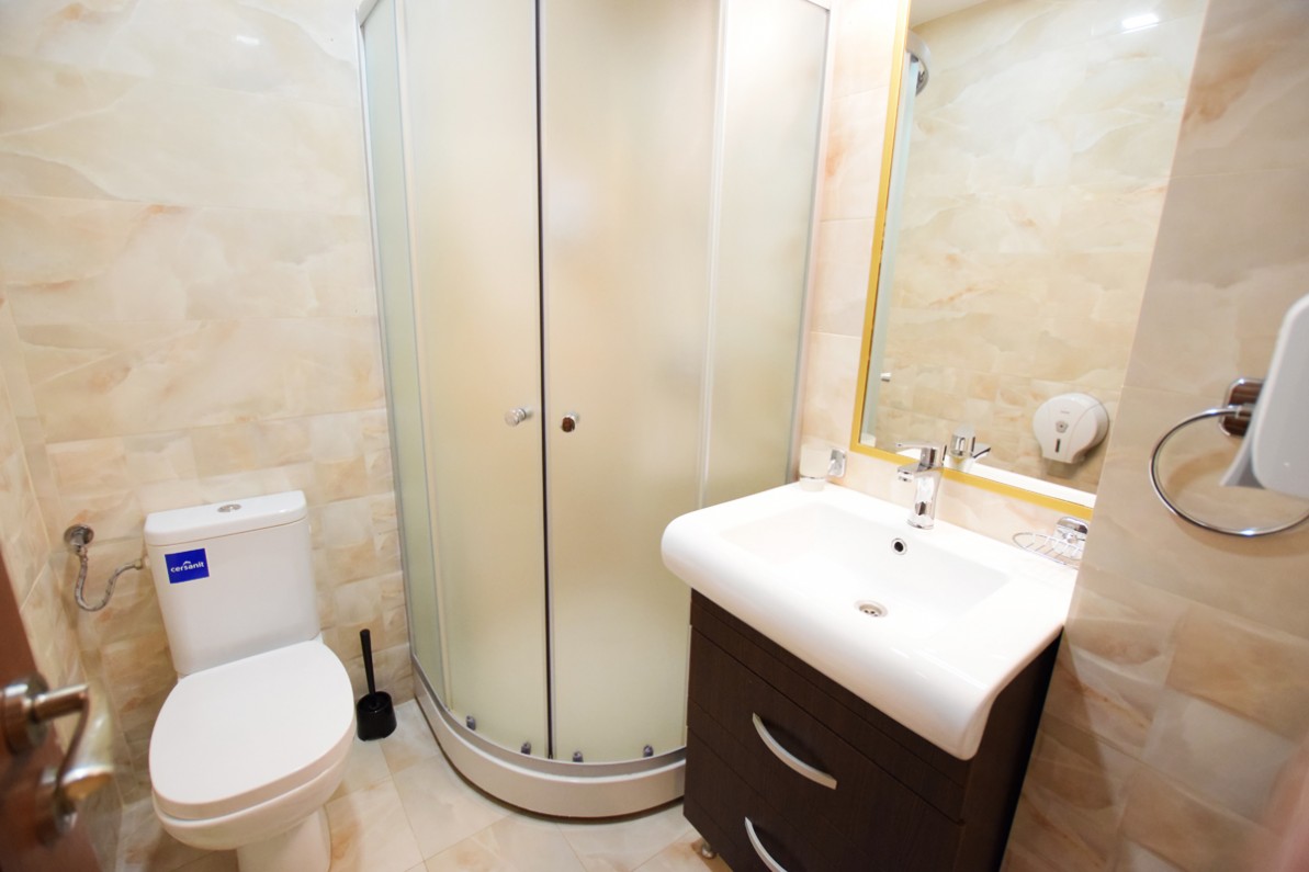 Baia este amenajata cu o cabina de dus, grup sanitar, lavoir cu dulapior, oglinda cu etajera si este dotata cu cosmetice hoteliere.