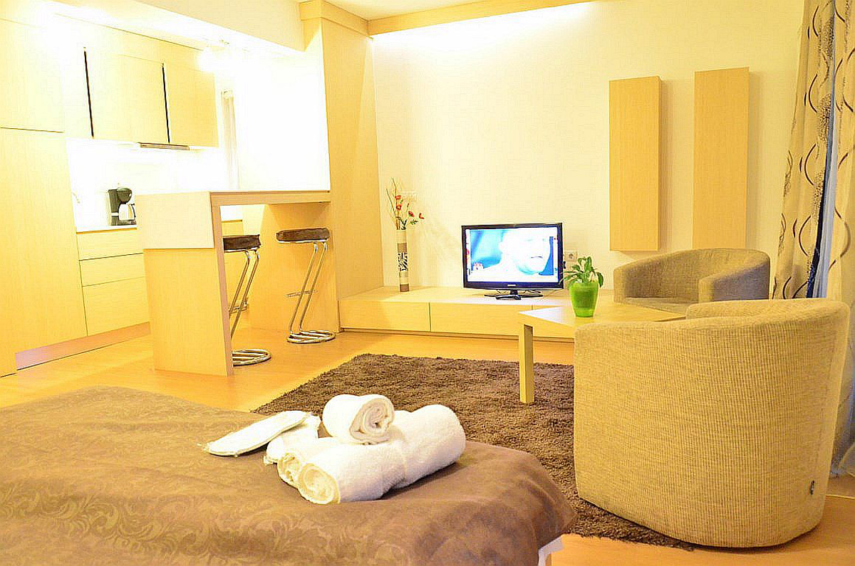 Garsoniera este mobilata cu dulap spatios pentru haine incastrat in perete. Aceasta dispune de pat dublu, cu doua noptiere, comoda TV cu sertare, televizor LCD, si corpuri suspendate. Camera este completata de un spatiu de relaxare format de doua fotolii si o masuta de cafea.