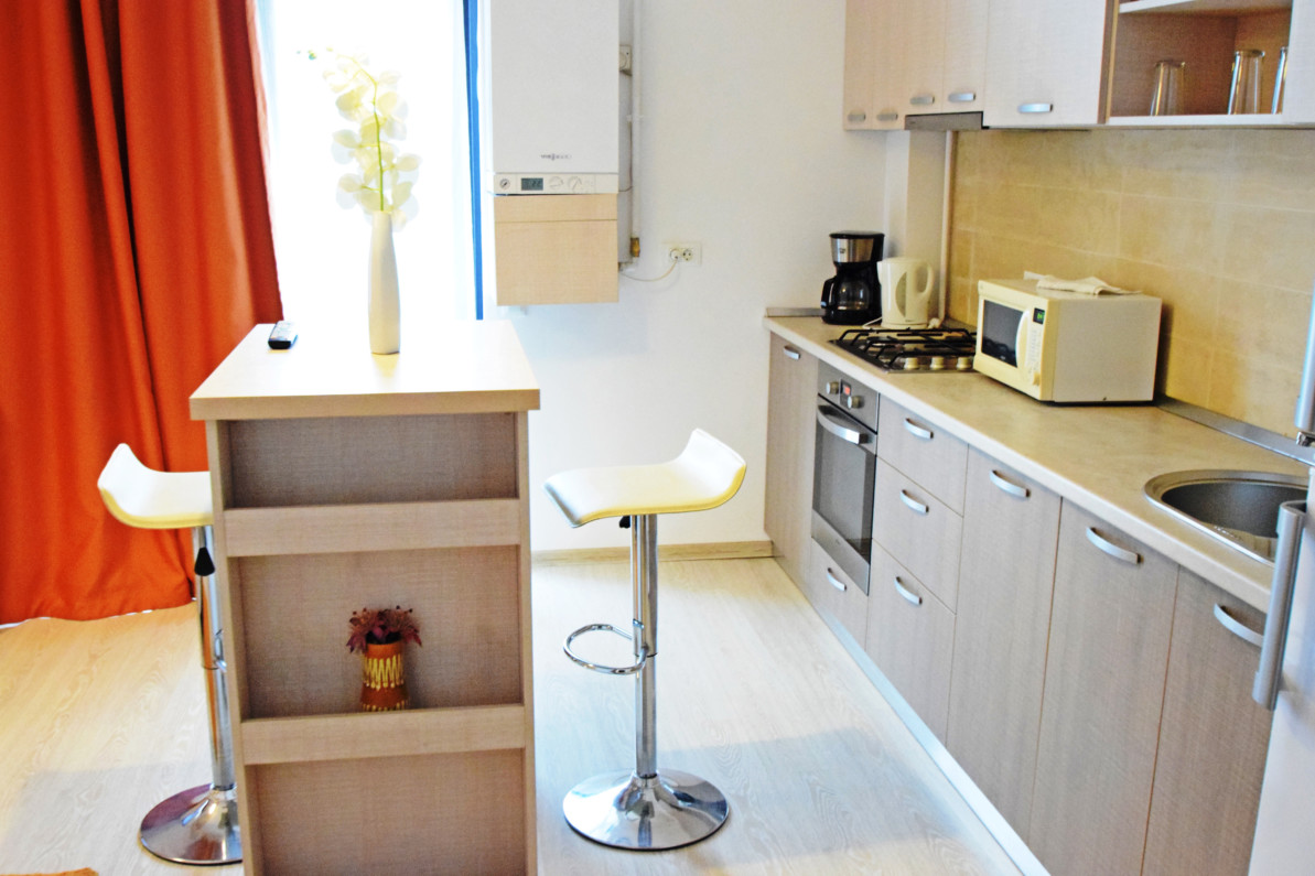 Bucataria este decomandata, moderna, utilata complet. Aici oaspetii vor gasi o chiuveta, cuptor electric, plita cu gaz, vesela si tacamurile necesare, fierbator pentru apa, filtru de cafea. Bucataria este mobilata si cu un bar cu doua scaune care completeaza perfect functionalitatea intregii garsoniere.