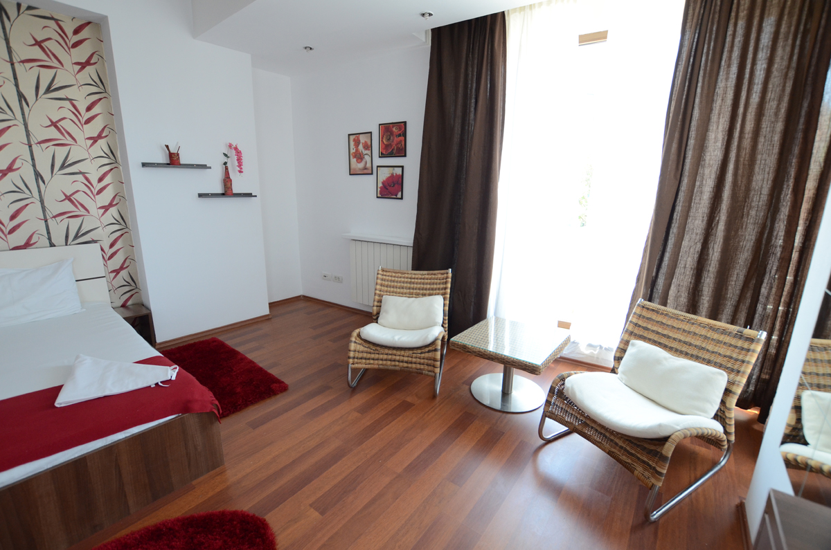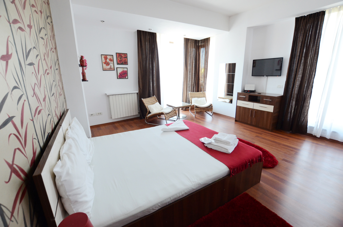 Garsoniera regim hotelier ofera o camera de zi spatioasa, mobilata cu un pat dublu si doua noptiere, comoda TV, spatiu de relaxare cu masuta si 2 fotolii. Perdelele si draperiile asigura intimitatea necesara pentru ca garsoniera are orientare spre strada Mihai Eminescu si beneficiaza de geamuri mari, luminoase.